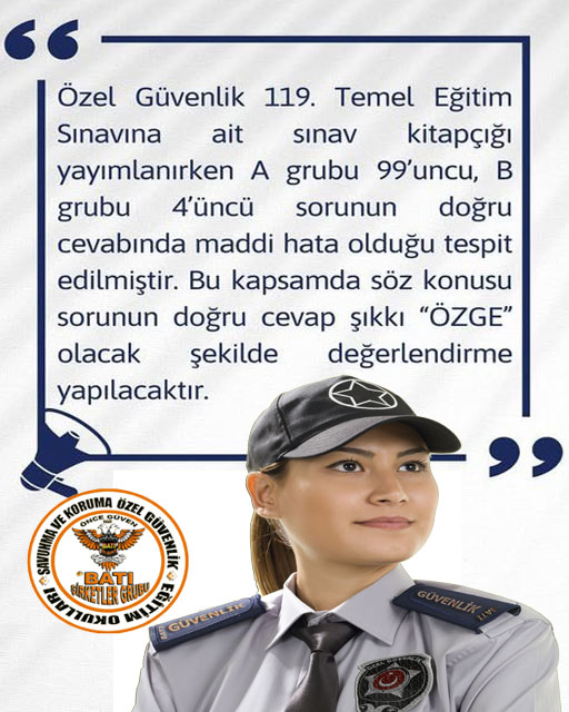 ÖZEL GÜVENLİK 104. TEMEL EĞİTİM VE 80. YENİLEME EĞİTİMİ SINAVI’NA AİT SORU KİTAPÇIKLARI VE CEVAP ANAHTARLARI YAYIMLANMIŞTIR.
