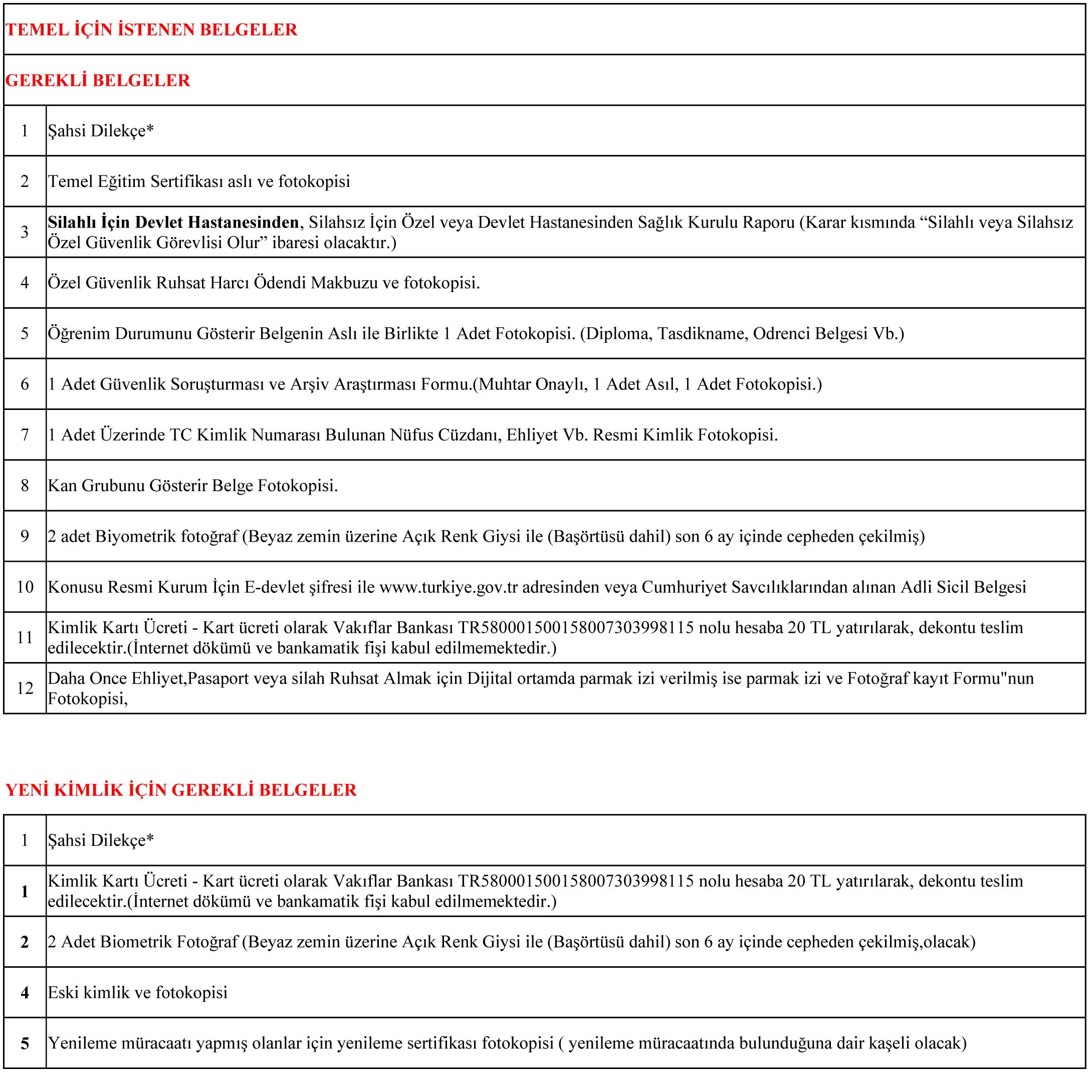 Şahsi Dilekçe Temel Eğitim Sertifikasının aslı ve fotokopisi Devlet hastanelerinden alınan Sağlık Kurulu Raporu (Karar kısmında “Silahlı Özel Güvenlik Görevlisi Olur.” ibaresi olacaktır) Öğrenim durumunu gösterir belgenin aslı ile birlikte 1 adet fotokopisi (Diploma, Tasdikname, Öğrenci Belgesi vb.) 2 adet Güvenlik Soruşturması ve Arşiv Araştırması Formu (Muhtar onaylı, 1 adet asıl, 1 adet fotokopisi) 2 Adet üzerinde TC Kimlik Numarası bulunan Nüfus Cüzdanı, Ehliyet vb. resmi kimlik fotokopisi. Kan grubunu gösterir belge fotokopisi. 4 adet vesikalık fotoğraf (Zemin rengi beyaz ve 4.5 X 6 cm ebadında) Özel Güvenlik Ruhsat Harcı ödendi makbuzu ve fotokopisi. Konusu “Resmi Kurum” olan, e-devlet şifresi ile www.turkiye.gov.tr adresinden veya Cumhuriyet Savcılıklarından alınan Adli Sicil Belgesi
